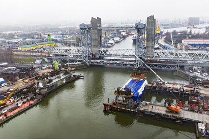 «В процессе сооружения башен русловых опор моста с помощью крана большой грузоподъёмности было смонтировано четыре приводных барабана — по одному в нижнюю часть каждой башни. К барабанам будет подсоединен электрический привод, с помощью которого будет подниматься русловой пролет. Сам привод будет расположен в машинном зале под проезжей частью моста», — рассказал генеральный директор ООО «СК «Мостотрест» (входит в группу компаний подрядчика) Евгений Надточий.