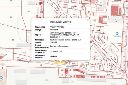 По данным публичной кадастровой карты Калининградской области, кадастровая стоимость земельного участка составляет 1 978 633,8 руб., уточнённая площадь — 780 кв.м.