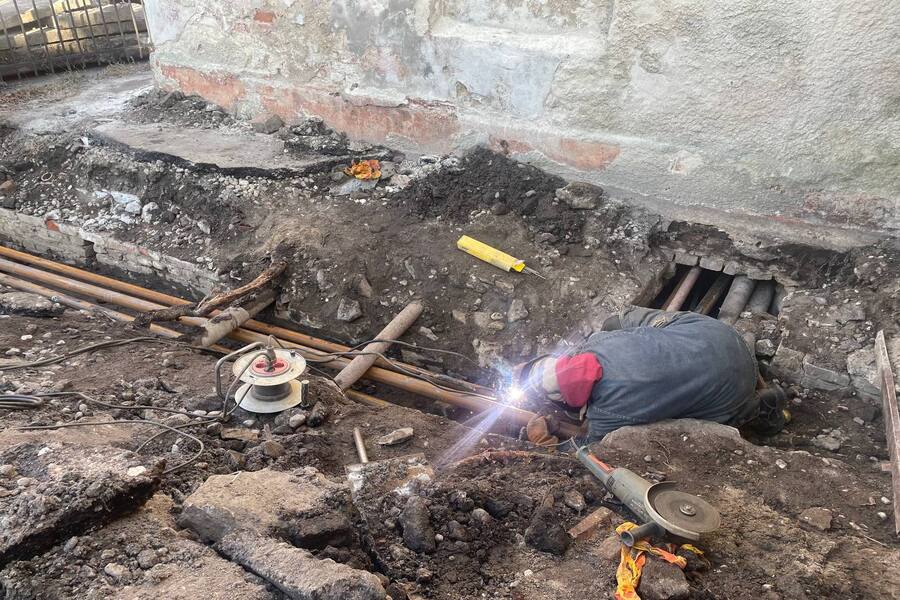 Для восстановления теплоснабжения работники предприятия «вскрыли» асфальтированное покрытие и оборудовали траншею длиной более 15 метров. Слесари извлекли изношенные элементы сети и заменили их на отрезки нового трубопровода — 38 метров сети отопления и 16 метров сети ГВС.