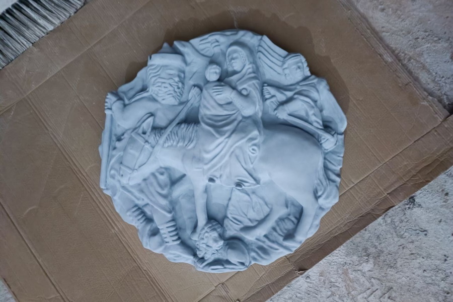 «Изначально необходимо было создать 3D-модель барельефа, — сообщил он. — Для этого я использовал фотографии 1920-х годов из замка Мариенбург, который находится в польском Мальборке. Дело в том, что там размещены копии барельефов из замка Тапиау. Готовую модель я распечатал, склеил, отшпаклевал и отлил. Правда, первая отливка мне не понравилась — головы девы Марии и младенца плохо вышли. А вот вторая версия удовлетворила».