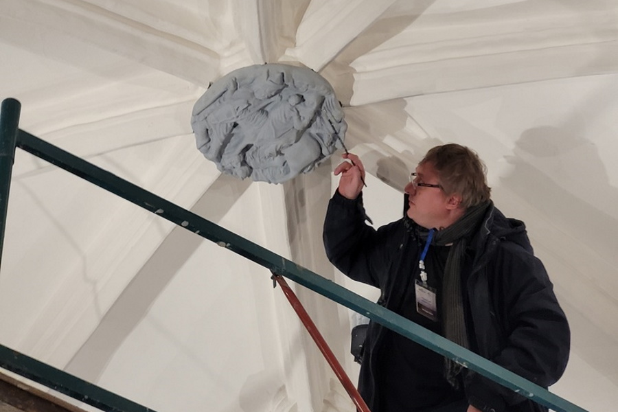 Готовый барельеф из усиленного гипса, по словам Юшенкова, весит примерно 16-17 кг. Во время монтажа он присутствовал на месте, чтобы проконтролировать процесс. Результат уже могут оценить посетители замка.