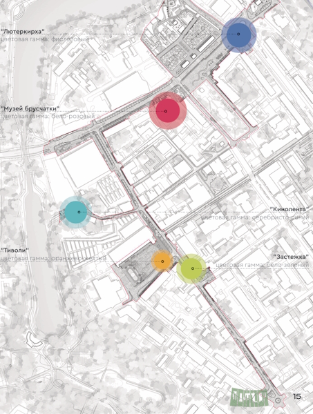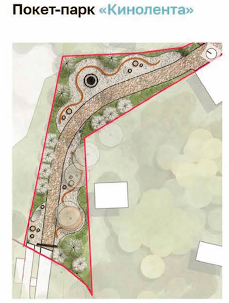 Согласно информации из презентации проекта, основной элемент покет- парка «Кинолента» — «декоративная лента, напоминающая киноленту, которая как бы размоталась с двух сторон от дорожки». Цветовая гамма покет-парка — серебристо-синий. Место расположения «Киноленты», ул. Госпитальная, по мнению авторов проекта «напоминает горную улочку Швейцарии или Италии».