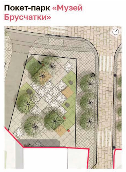 «Так как в городе представлено большое разнообразие брусчатки, это также является его уникальностью и должно быть представлено в том числе для туристов. Поэтому предлагается разместить покет-парк „Музей брусчатки“ около информационно туристического центра», — говорится в презентации проекта. Цветовая гамма покет-парка — бело-розовая.