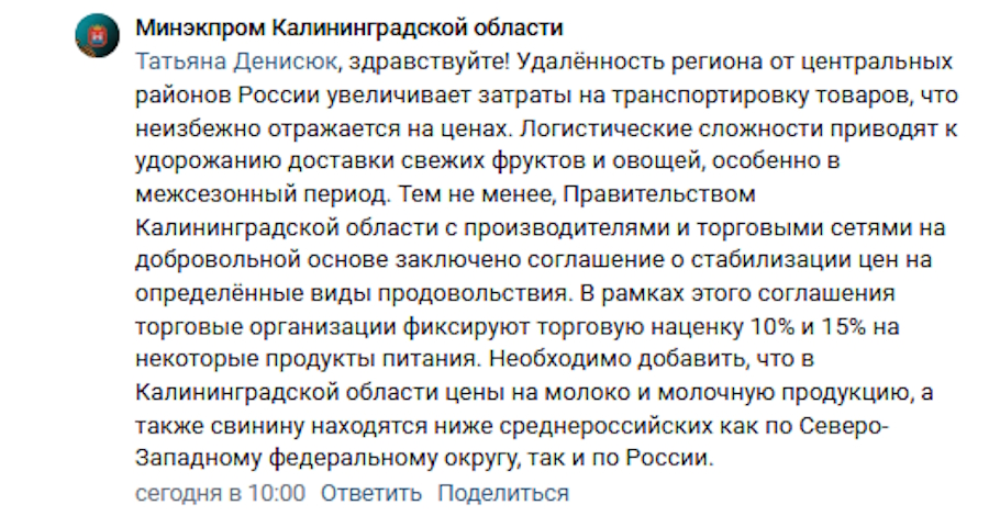 «Логистические сложности приводят к удорожанию доставки свежих фруктов и овощей, особенно в межсезонный период. Тем не менее, правительством Калининградской области с производителями и торговыми сетями на добровольной основе заключено соглашение о стабилизации цен на определённые виды продовольствия. <...> Необходимо добавить, что в Калининградской области цены на молоко и молочную продукцию, а также свинину находятся ниже среднероссийских как по Северо-Западному федеральному округу, так и по России», — говорится в ответе министерства.