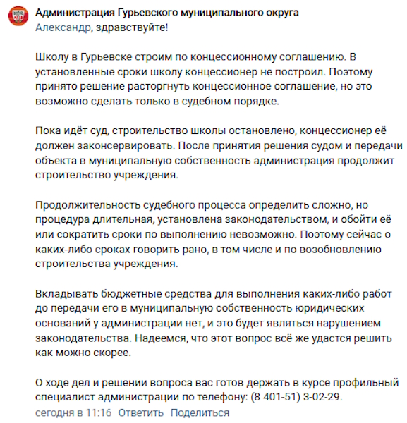 «Школу в Гурьевске строим по концессионному соглашению. В установленные сроки школу концессионер не построил. Поэтому принято решение расторгнуть концессионное соглашение, но это возможно сделать только в судебном порядке. Пока идёт суд, строительство школы остановлено, концессионер её должен законсервировать. После принятия решения судом и передачи объекта в муниципальную собственность администрация продолжит строительство учреждения», — ответили представители администрации муниципалитета.