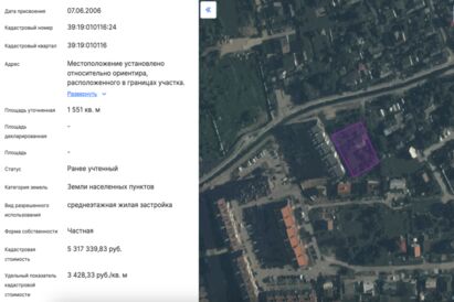 Строительство запланировано на участке с кадастровым номером 39:19:010116:24. Его уточнённая площадь составляет 1 551 кв. м, а стоимость по кадастру — 5 317 339,83 руб. Согласно данным публичной кадастровой карты, участок предназначен под среднеэтажную жилую застройку. Разрешение будет действительно до 14 мая 2027 года.