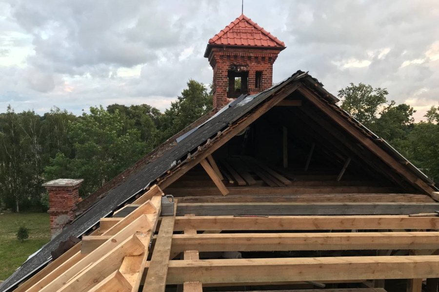 «Месяц назад мы сняли шиферную кровлю и приступили к частичной замене балок и установке новых стропил, — сообщил Наталич. — Сечение стропил мы подобрали сантиметр в сантиметр, то есть брус практически идентичный довоенному. Древесину, кстати, используем местную».