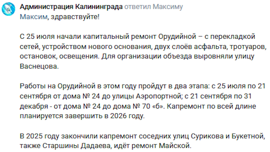 Капитальный ремонт ул. Орудийной в Калининграде начался 25 июля. Завершить работы, которые будут состоять из двух этапов, планируют в 2026 году. Об этом сообщили сотрудники горадминистрации в комментариях на странице губернатора Алексея Беспрозванных в соцсети «ВКонтакте».