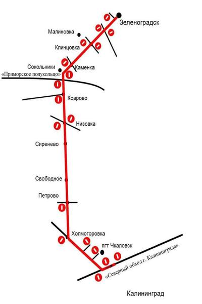 «Зеленоградск – Приморск через Светлогорск» (на участке от поселка Коврово до Зеленоградска).