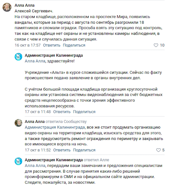 Ответ последовал от сотрудников администрации Калининграда: «Учреждение „Альта“ в курсе сложившейся ситуации. Сейчас по факту происшествия подано заявление в органы внутренних дел. С учётом большой площади кладбища организация круглосуточной охраны или установка системы видеонаблюдения за счёт бюджетных средств нецелесообразна с точки зрения эффективного использования ресурсов».
