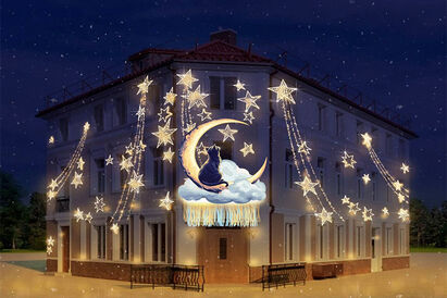 Согласно эскизам, опубликованным на портале госзакупок, ЗАГС планируют украсить конструкцией в виде кота, сидящего на луне, облака и звёзд. Подрядчику предстоит изготовить металлический каркас из труб, вырезать из алюминиевого композита фигуры месяца и кота, сверху смонтировать фактурный пенопласт с художественной росписью. По тому же принципу изготавливается облако. На заднюю стенку подложки необходимо установить неон с тёплым белым свечением. Под балкон натягивается металлическая сетка, на которую навязываются голубые и золотые ленты. Срок гарантии на изделие — 12 месяцев.