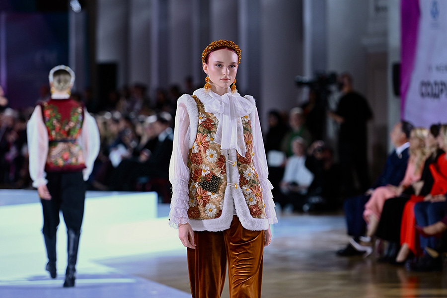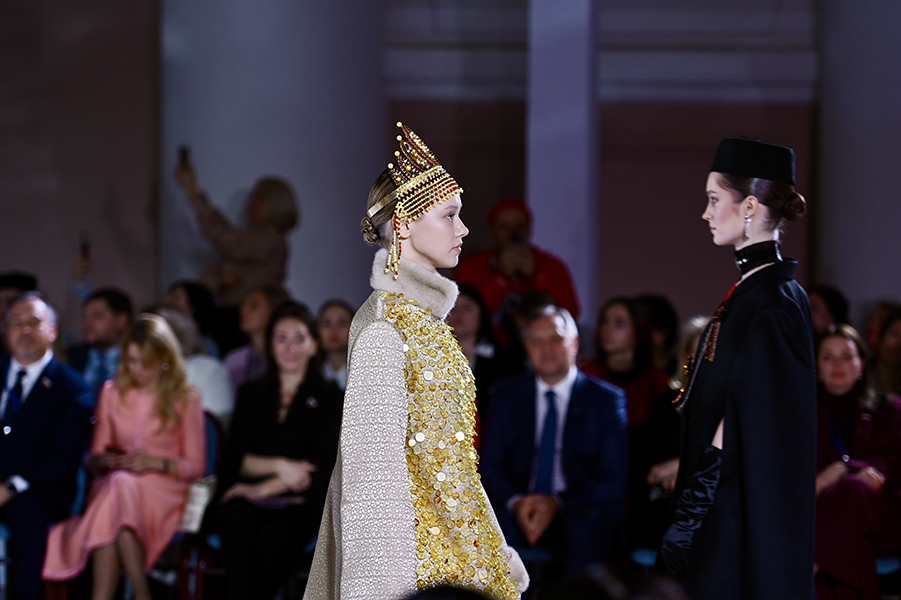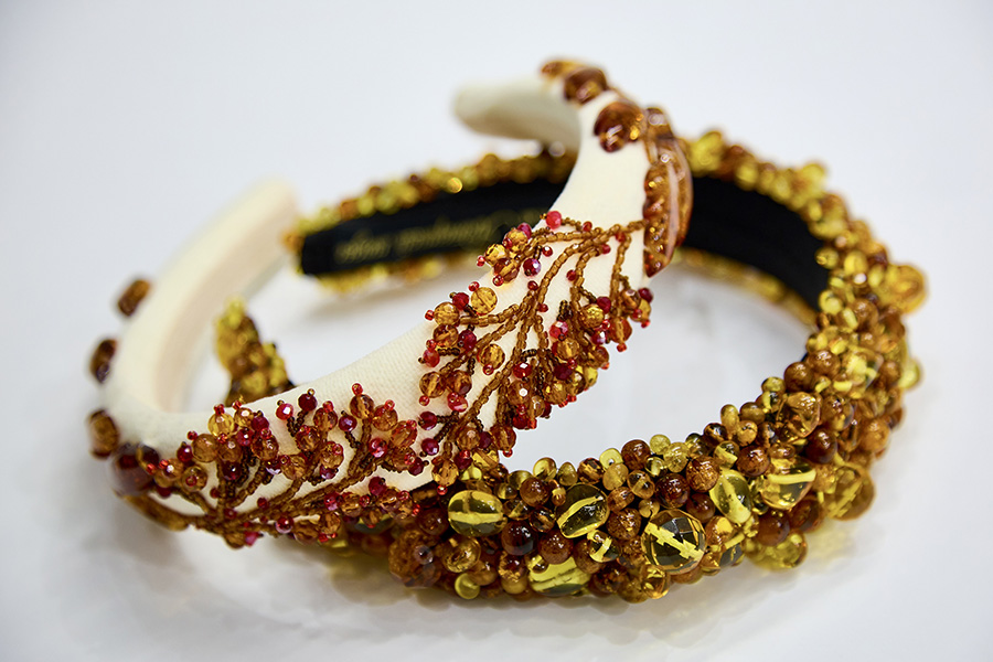 Специально к показу в рамках форума Янтарный комбинат дополнил свою коллекцию одежды в русском стиле новыми головными уборами. На подиуме также были продемонстрированы современные варианты обруча для волос — ободки, расшитые натуральным янтарём. Аксессуары созданы в творческой мастерской Дома янтарной моды — экспериментальной площадке по интеграции солнечного камня в одежду.