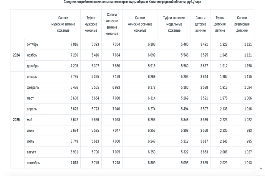 Калининградстат проследил, как менялись цены на некоторые модели обуви за последний год в Калининградской области. Так, зимние женские кожаные сапоги дешевле всего можно было купить в феврале (6993 руб.), а дороже — в декабре (7860 руб.). Мужские зимние сапоги также дешевле всего можно было приобрести в феврале — 6467 руб.