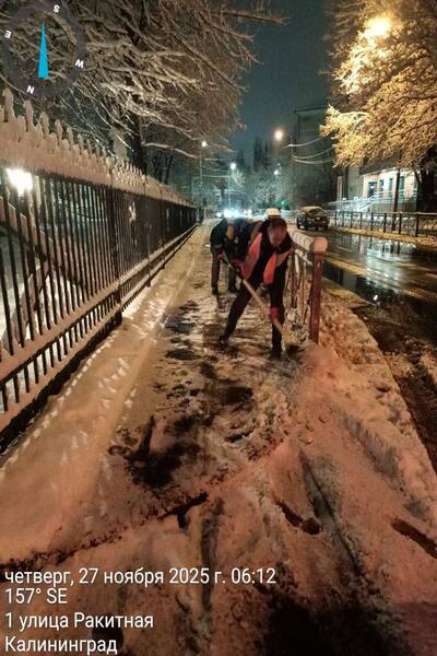 Сотрудники МБУ «Чистота» проводили уборку и обработку улиц города от снега и наледи всю ночь, дворники вышли на улицы в 4 утра. Об этом заявила глава администрации Калининграда Елена Дятлова в своём телеграм-канале.