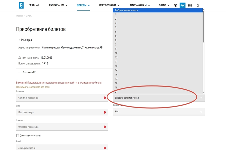 Выбор места доступен «при внесении данных, справа». Кроме того, как сообщили в автовокзале, на областные маршруты продажа ведется только из городов, где есть подразделения предприятия.