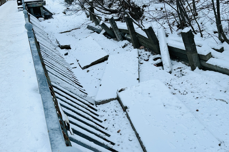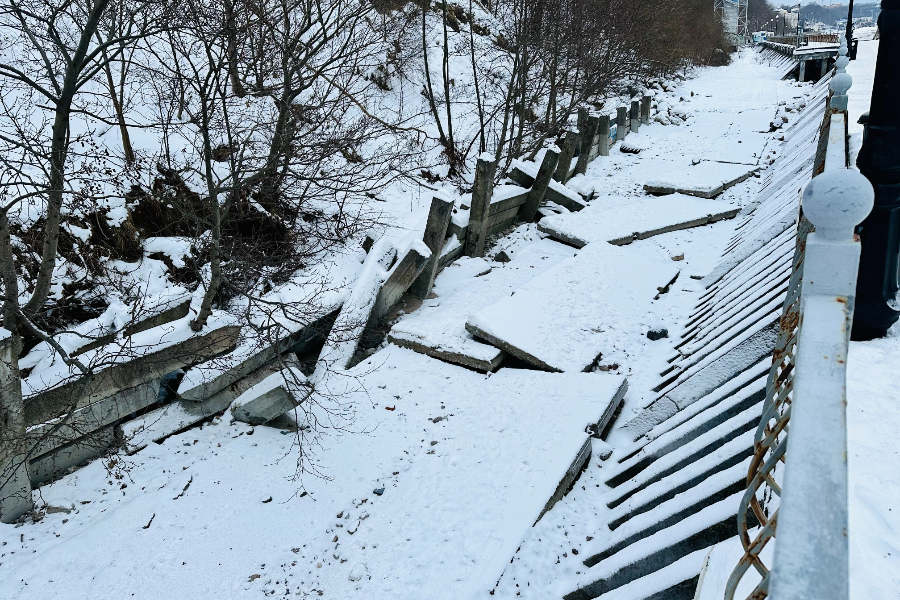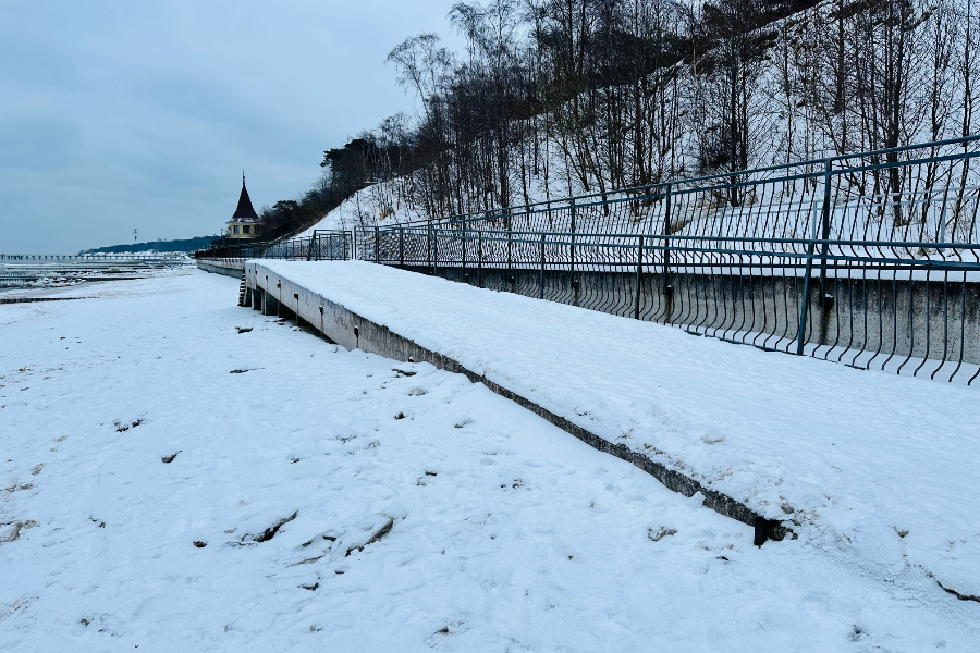 Кроме того, зафиксированы повреждения ограждений променада. В отдельных местах металлические конструкции деформированы, а на втором спуске к пляжу в районе Соснового бора ограждение отсутствует полностью.