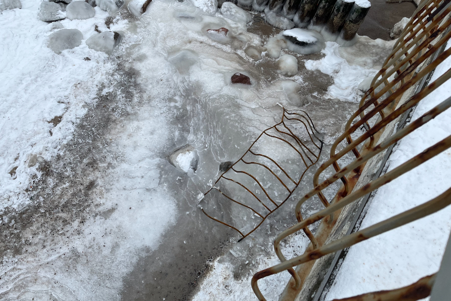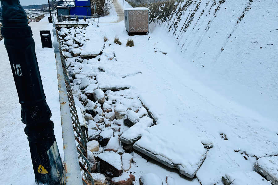 Осмотр территории также показал, что пляж находится в неудовлетворительном состоянии. Часть береговой линии размыта: с обратной стороны променада, где ранее находился песок, сейчас лежат бетонные плиты, которые, предположительно, ранее были скрыты под песчаным слоем и оказались оголены после штормов.