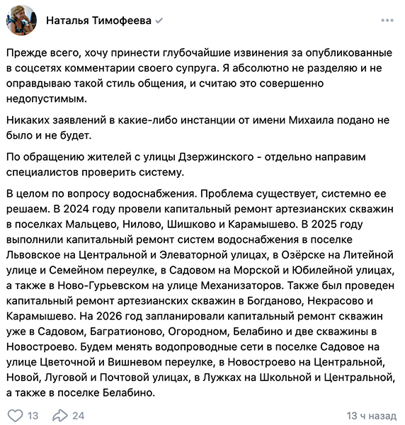 «Прежде всего, хочу принести глубочайшие извинения за опубликованные в соцсетях комментарии своего супруга. Я абсолютно не разделяю и не оправдываю такой стиль общения и считаю это совершенно недопустимым. Никаких заявлений в какие-либо инстанции от имени Михаила подано не было и не будет», — написала Наталья Тимофеева на своей странице в соцсети «ВКонтакте».