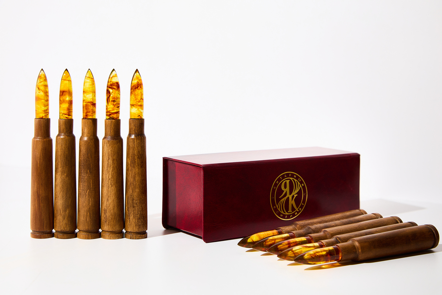 Сувенир выпущен ограниченной серией — всего изготовлено 60 изделий. За образец взят патрон калибра 12,7×108 мм для советского пулемета «Утёс». Каждый сувенир в точности повторяет форму патрона и состоит из гильзы и пули. В качестве материалов использован бук и мелкофракционный прозрачный янтарь.