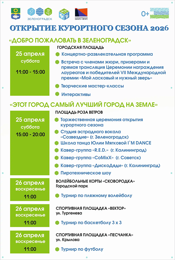 На городской площади с 11 до 15 часов пройдут концертно-развлекательная программа, встреча с призёрами и прямая трансляция церемонии награждения международной премии «Мой ласковый и нужный зверь», а также творческие мастер-классы и интерактивы. На площади «Роза ветров» гостей ждут с 15 до 20 часов. Там состоится торжественная церемония открытия курортного сезона, выступят вокалисты, танцоры и кавер-группы, в том числе «ДискоДяди» из Калининграда. Также ожидается пиротехническое шоу.
