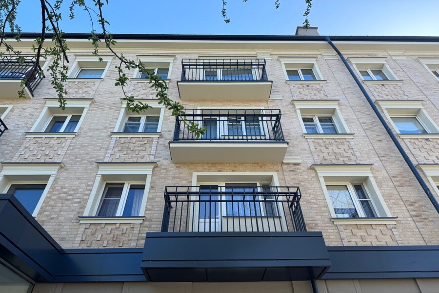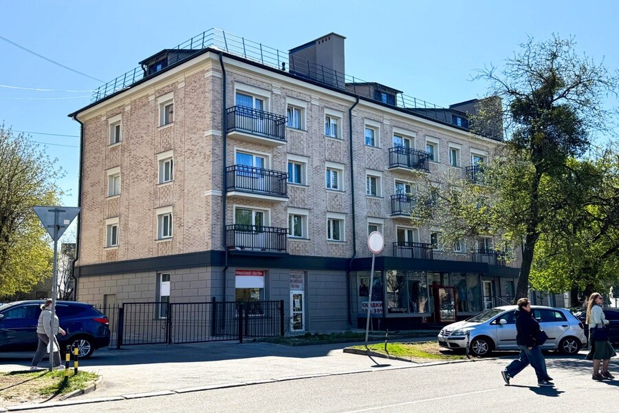 На смену остеклению пришли балконные ограждения с цветочницами в едином стиле. Первый этаж коммерции также обрёл целостный вид — его оформили рустовкой с плавными переходами между блоками и завершили единым фризом в тон новой фальцевой кровли.