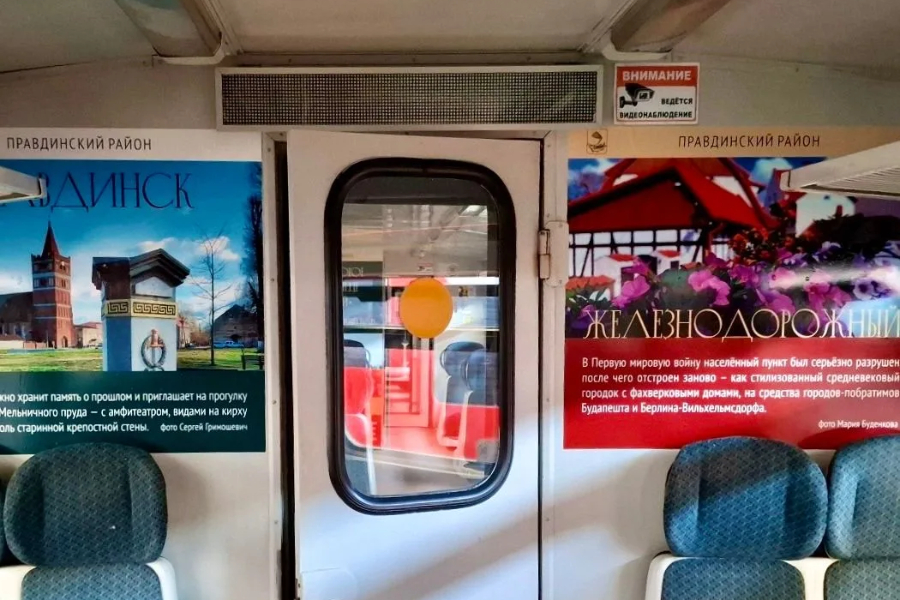 Как уточнили в компании, вагоны оформлены в тематике достопримечательностей Правдинского округа: внутри размещены постеры с фотографиями и краткой информацией о районе и самом поселке Железнодорожный.